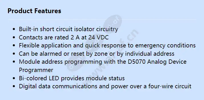 Built-in short circuit isolator circuitry Contacts are rated 2 A at 24 VDC Flexible application and quick response to emergency conditions Can be alarmed or reset by zone or by individual address Module address programming with the D5070 Analog Device Programmer Bi-colored LED provides module status Digital data communications and power over a four-wire circuit Dimension (H x W x D) (in) 4.70 x 4.20 x 1.40 in. Dimension (H x W x D) (mm) 119 x 107 x 36 mm LED color Red Operating temperature (°C) 0 – 49 °C Operating temperature (°F) 32 – 120 °F