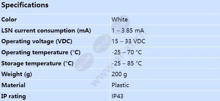 Volume of up to 92.1 dB(A) Maximum current consumption of less than 3.85 mA Up to 100 sounders per LSN loop Immediate synchronization 32 different tone types can be selected (incl. DIN tone) Color White IP rating IP43 LSN current consumption (mA) 1 – 3.85 mA Material Plastic Operating temperature (°C) -25 – 70 °C Operating voltage (VDC) 15 – 33 VDC Storage temperature (°C) -25 – 85 °C Weight (g) 200 g