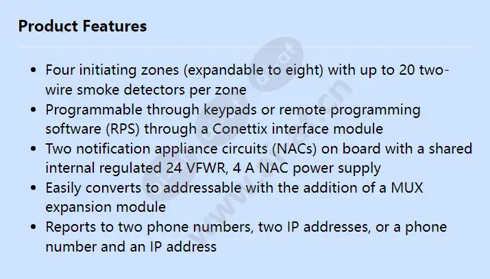 Four initiating zones (expandable to eight) with up to 20 two-wire smoke detectors per zone Programmable through keypads or remote programming software (RPS) through a Conettix interface module Two notification appliance circuits (NACs) on board with a shared internal regulated 24 VFWR, 4 A NAC power supply Easily converts to addressable with the addition of a MUX expansion module Reports to two phone numbers, two IP addresses, or a phone number and an IP address Input voltage (VDC) 20.40 – 28.20 VDC Operating temperature (°C) 0 – 49 °C