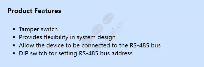 Tamper switch Provides flexibility in system design Allow the device to be connected to the RS-485 bus DIP switch for setting RS-485 bus address Current consumption (mA) 5 – 65 mA