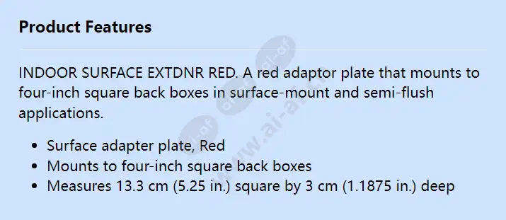 INDOOR SURFACE EXTDNR RED. A red adaptor plate that mounts to four-inch square back boxes in surface-mount and semi-flush applications. Surface adapter plate, Red Mounts to four-inch square back boxes Measures 13.3 cm (5.25 in.) square by 3 cm (1.1875 in.) deep Item Type Wire Tracer Home Control Wi-Fi Alarm I/O 2/2