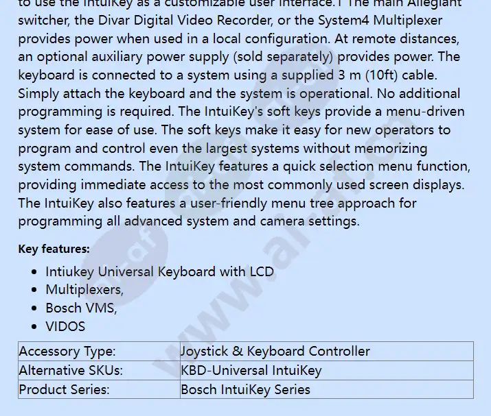 Bosch KBD-Universal IntuiKey Universal Keyboard with LCD The IntuiKey Series keyboards are full function, multipurpose keyboards used for system control and programming. The IntuiKey includes an integral variable speed pan/tilt/zoom (PTZ) joystick and a splash resistant design. An optional rack mount kit allows the IntuiKey to be mounted in a standard EIA 48 cm (19 in.) rack. The IntuiKey Digital Keyboard is available in two models, KBD-Universal and KBD-Digital. The Universal version can be connected to an Allegiant switcher and either Divar Digital Video Recorders or System4 Multiplexers at the same time. This capability eliminates the need for multiple keyboards. The KBDDigital version supports Divar Digital Video Recorders and System4 Multiplexers. Both types can be used with the