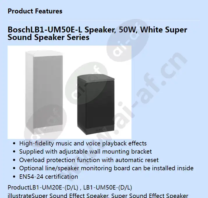 BoschLB1-UM50E-L Speaker, 50W, White Super Sound Speaker Series High-fidelity music and voice playback effects Supplied with adjustable wall mounting bracket Overload protection function with automatic reset Optional line/speaker monitoring board can be installed inside EN54-24 certification Product LB1-UM20E-(D/L) , LB1-UM50E-(D/L) illustrate Super Sound Effect Speaker, Super Sound Effect Speaker Max. power 30 W , 75 W Rated power (PHC) 20 W , 50 W Power tap 20 / 10 / 5 / 2.5 W , 50/25/12.5/6.25W Rated power / Sound pressure level at 1 W (1 kHz, 1 meter) 101 dB / 88 dB (SPL), 108 dB / 91 dB (SPL) Sound pressure level at rated power/1W (1kHz, 4 meters) 87 dB / 74 dB (SPL), 94 dB / 79 dB (SPL) Effective frequency range(-10 dB) 90 Hz to 20 kHz , 90 Hz to 20 kHz Opening angle at 1 kHz/4 kHz