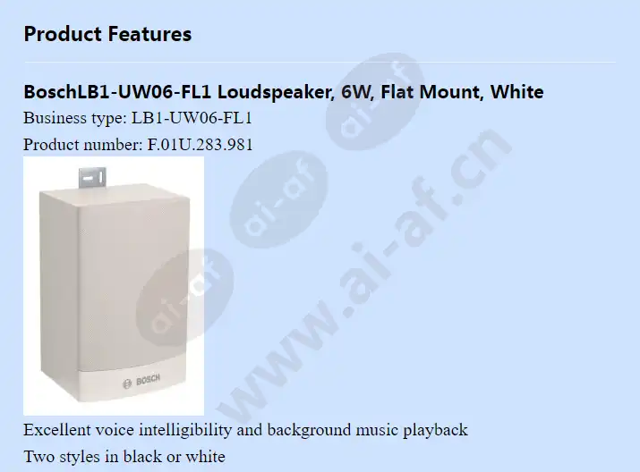 Bosch LB1-UW06-FL1 Loudspeaker, 6W, Flat Mount, White Business type: LB1-UW06-FL1 Product number: F.01U.283.981 Excellent voice intelligibility and background music playback Two styles in black or white MDF structure Mounting bracket for installation on the wall or ceiling Meet the requirements of international installation and safety regulations Max. power 9 W Rated power 6 / 3 / 1.5 W Sound pressure level at 6 W/1 W (1 kHz, 1 m) 99 dB / 91 dB (SPL) Sound pressure level at 6 W/1 W (4 kHz, 1 meter) 100 dB / 92 dB (SPL) Effective frequency range (-10 dB) 180Hz to 20kHz Open Angle 1 kHz/4 kHz (-6 dB) level 165° / 95° vertical 158° / 73° Rated input voltage 100 V Rated impedance 1667 ohms Interfaces 4-pin push-in terminal block Dimensions (HxWxD) 240 x 151 x 139 mm (9.4 x 5.9 x 5.5 inches)