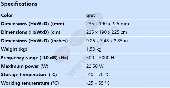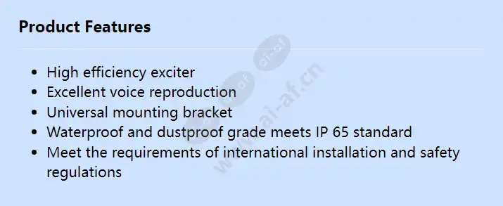 High efficiency exciter Excellent voice reproduction Universal mounting bracket Waterproof and dustproof grade meets IP 65 standard Meet the requirements of international installation and safety regulations Storage temperature (°C) -40 – 70 °C Storage temperature (°F) -40 – 158 °F Dimensions (HxWxD) (cm) 235 x 190 x 225 cm Dimensions (HxWxD) (inches) 9.25 x 7.48 x 8.85 in. Dimensions (HxWxD) ((mm) 235 x 190 x 225 mm Working temperature (°C) -25 – 55 °C Working temperature (°F) -13 – 131 °F Maximum power (W) 22.50 W Materials Plastic (ABS) horizontal x vertical coverage angle (-6 dB, 1 kHz) (°) 70 x 70 ° horizontal x vertical coverage angle (-6 dB, 4 kHz) (°) 25 x 25 ° weight / gram) 1500 g Weight (kg) 1.50 kg Weight (lbs) 3.30 lb Frequency range (-10 dB) (Hz) 500 – 5000 Hz Color grey
