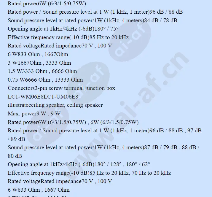 Bosch LC1-CMR Mounting ring for LC1 LC1-CMR Mounting ring for LC1 Ceiling mount ring with screw driven ceiling clips for securing LC1 ceiling loudspeakers to the ceiling, EN54-24 certified, white RAL 9010. Business Type: LC1-CMR Product number: F . 01U.075.453 LC1 Modular Ceiling Speaker Series Extraordinary voice and music reproduction Uniform mask size and complete set of accessories ensure easy and quick installation A variety of different ceiling installation methods Optional Pilot Tone indication Pass EN 54-24, UL2043, UL1480 certification LC1-WC06E8 illustrate Ceiling Speaker Max. power 9 W Rated power 6W (6/3/1.5/0.75W) Rated power / Sound pressure level at 1 W (1 kHz, 1 meter) 96 dB / 88 dB Sound pressure level at rated power/1W (1kHz, 4 meters) 84 dB / 78 dB Opening angle at