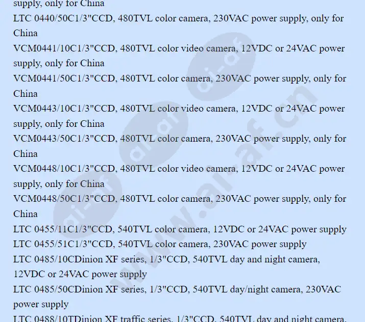Bosch LTC0235/10 1/4"CCD, 330TVL color camera, 12Vdc or 24Vac power supply color camera LTC 0235/10 1/4"CCD, 330TVL color camera, 12Vdc or 24Vac power supply LTC 0255/10 1/4"CCD, 480TVL color camera, 12Vdc or 24Vac power supply LTC 0435/10 1/3"CCD, 330TVL color camera, 12Vdc or 24Vac power supply LTC 0435/50 1/3"CCD, 330TVL color camera, 230Vac power supply LTC 0440/10C 1/3"CCD, 480TVL color video camera, 12VDC or 24VAC power supply, only for China LTC 0440/50C 1/3"CCD, 480TVL color camera, 230VAC power supply, only for China VCM0441/10C 1/3"CCD, 480TVL color video camera, 12VDC or 24VAC power supply, only for China VCM0441/50C 1/3"CCD, 480TVL color camera, 230VAC power supply, only for China VCM0443/10C 1/3"CCD, 480TVL color video camera, 12VDC or 24VAC power supply, only for China
