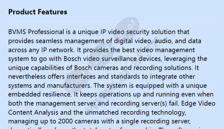 BVMS Professional is a unique IP video security solution that provides seamless management of digital video, audio, and data across any IP network. It provides the best video management system to go with Bosch video surveillance devices, leveraging the unique capabilities of Bosch cameras and recording solutions. It nevertheless offers interfaces and standards to integrate other systems and manufacturers. The system is equipped with a unique embedded resilience. It keeps operations up and running even when both the management server and recording server(s) fail. Edge Video Content Analysis and the unmatched recording technology, managing up to 2000 cameras with a single recording server, dramatically reduces the total costs of ownership. The software is provided as an e-license via