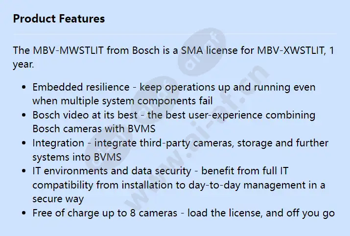 The MBV-MWSTLIT from Bosch is a SMA license for MBV-XWSTLIT, 1 year. Embedded resilience - keep operations up and running even when multiple system components fail Bosch video at its best - the best user-experience combining Bosch cameras with BVMS Integration - integrate third-party cameras, storage and further systems into BVMS IT environments and data security - benefit from full IT compatibility from installation to day-to-day management in a secure way Free of charge up to 8 cameras - load the license, and off you go