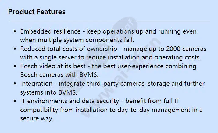 Embedded resilience - keep operations up and running even when multiple system components fail. Reduced total costs of ownership - manage up to 2000 cameras with a single server to reduce installation and operating costs. Bosch video at its best - the best user-experience combining Bosch cameras with BVMS. Integration - integrate third-party cameras, storage and further systems into BVMS. IT environments and data security - benefit from full IT compatibility from installation to day-to-day management in a secure way. Maximum number of workstations 100 Maximum number of cameras 2000 Maximum number of live and playback sites 9999 Maximum number of stitching channels 100 Maximum number of intrusion panels 20 Maximum number of DVR 50 Maximum number of VRM 128 Maximum number of sustained