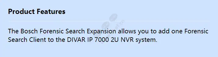 The Bosch Forensic Search Expansion allows you to add one Forensic Search Client to the DIVAR IP 7000 2U NVR system. Technology Digital - IP Accessory Type Recorder Software Software Type Expansion License Features Expansion Software