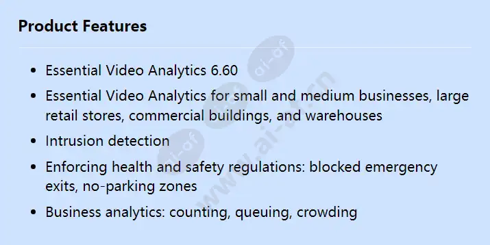 Essential Video Analytics 6.60 Essential Video Analytics for small and medium businesses, large retail stores, commercial buildings, and warehouses Intrusion detection Enforcing health and safety regulations: blocked emergency exits, no-parking zones Business analytics: counting, queuing, crowding Essential Video Analytics 6.60 Available on 4000 - 6000 series IP cameras from Bosch based on CPP generations CPP7 and CPP7.3