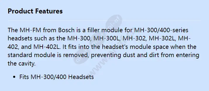 The MH-FM from Bosch is a filler module for MH-300/400-series headsets such as the MH-300, MH-300L, MH-302, MH-302L, MH-402, and MH-402L. It fits into the headset's module space when the standard module is removed, preventing dust and dirt from entering the cavity. Fits MH-300/400 Headsets