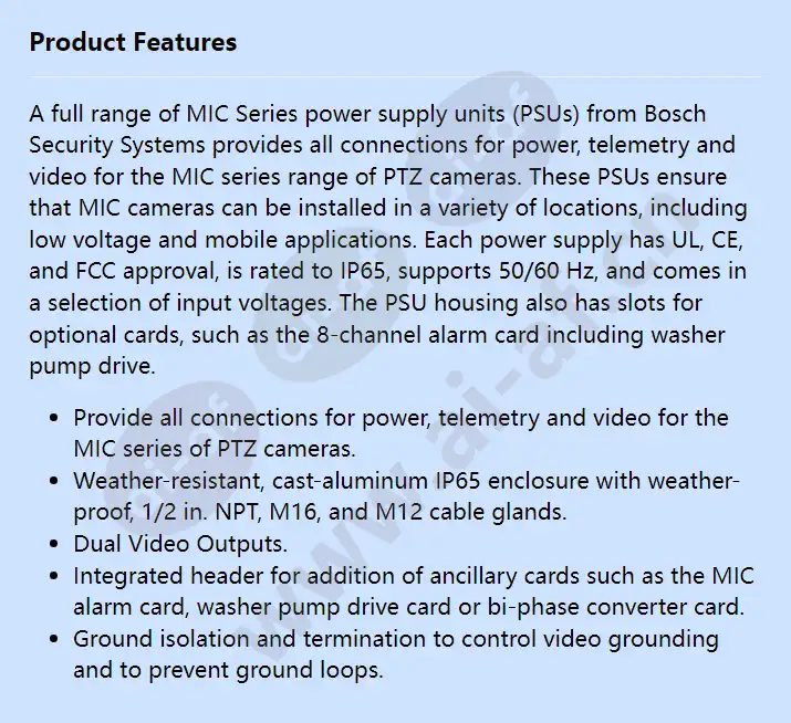A full range of MIC Series power supply units (PSUs) from Bosch Security Systems provides all connections for power, telemetry and video for the MIC series range of PTZ cameras. These PSUs ensure that MIC cameras can be installed in a variety of locations, including low voltage and mobile applications. Each power supply has UL, CE, and FCC approval, is rated to IP65, supports 50/60 Hz, and comes in a selection of input voltages. The PSU housing also has slots for optional cards, such as the 8-channel alarm card including washer pump drive. Provide all connections for power, telemetry and video for the MIC series of PTZ cameras. Weather-resistant, cast-aluminum IP65 enclosure with weather-proof, 1/2 in. NPT, M16, and M12 cable glands. Dual Video Outputs. Integrated header for addition of