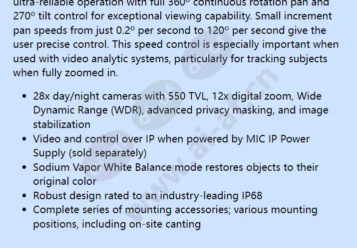 The MIC-550ALB28N from Bosch is a MIC550 aluminum 28X, day/night, PTZ, black, NTSC. The MIC Series 550 camera combines cutting-edge technology with the latest production techniques to provide a class-leading feature set in an economical package. The MIC Series 550 range takes high-quality surveillance to new levels of excellence. As a best-fit camera for virtually any security application, it can be installed in the harshest of environments. Thanks to its IP68-rated aluminum casing, the MIC Series 550 camera functions perfectly in the most demanding conditions. This tough and vandal-resistant casing provides protection from the elements and physical attack. An integrated long-life silicone wiper and a reversible rain shield ensure high-quality images regardless of the installed