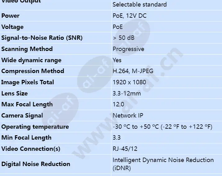 Stylish indoor network camera 1080p resolution for sharp images Intelligent Dynamic Noise Reduction reduces bandwidth and storage requirements by up to 50% SD card slot for local recording FTP, Dropbox and e-mail alarms Features Auto Gain Control, Automatic White Balance, Back Light Compensation, Day/Night, Digital Noise Reduction, Motion Detection Tracking, ONVIF, Privacy Masking, Wide Dynamic Range Technology Digital - IP Housing Color Black Audio 2-Way Mic Image Sensor Day/Night (NO IR) Optical Format 1/2.7" Resolution HD: 1920 x 1080 Scanning Method Progressive Compression H.264, MJPEG Max Focal Length 12.0 PoE Class 802.3af: ≤ 4.0 W Environment Indoor, Low Temp (<14°F) Lens Varifocal Video Connection(s) RJ-45/12 Min Focal Length 3.3 Internal Storage Memory Card Slot Power PoE, 12V