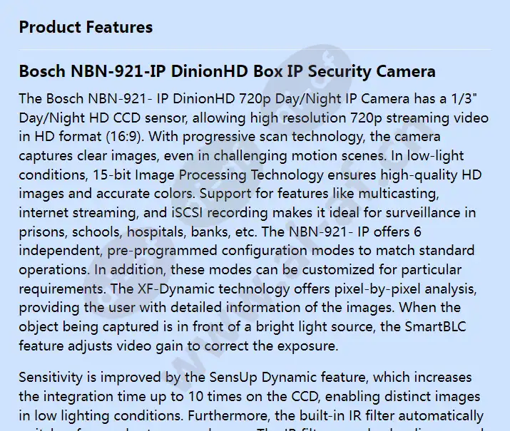 Bosch NBN-921-IP DinionHD Box IP Security Camera The Bosch NBN-921- IP DinionHD 720p Day/Night IP Camera has a 1/3" Day/Night HD CCD sensor, allowing high resolution 720p streaming video in HD format (16:9). With progressive scan technology, the camera captures clear images, even in challenging motion scenes. In low-light conditions, 15-bit Image Processing Technology ensures high-quality HD images and accurate colors. Support for features like multicasting, internet streaming, and iSCSI recording makes it ideal for surveillance in prisons, schools, hospitals, banks, etc. The NBN-921- IP offers 6 independent, pre-programmed configuration modes to match standard operations. In addition, these modes can be customized for particular requirements. The XF-Dynamic technology offers