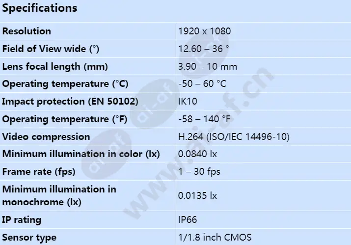 Wireless or remote configuration and commissioning with the Project Assistant app. Pan, Tilt, Roll and Zoom (PTRZ) to set the camera to the required field of view, without having to touch the camera or lens 1/1.8" 6MP sensor and starlight technology to provide detailed images even in extreme low-light situations High Dynamic Range to see every detail in both bright and dark areas of the scene Built-in Intelligent Video Analytics with object detection to trigger alerts and quickly retrieve data with the highest levels of reliability Camera Trainer to train the camera to recognize user-specified target objects for both moving and non-moving objects Field of View wide (°) 12.60 – 36 ° Frame rate (fps) 1 – 30 fps Impact protection (EN 50102) IK10 IP rating IP66 Lens focal length (mm) 3.90 –