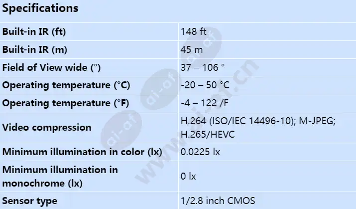 Easy to install with auto zoom/focus lens, wizard and pre-configured modes Built-in Essential Video Analytics to trigger relevant alerts and quickly retrieve data Fully configurable H.265 multi-streaming High Dynamic Range to see every detail in both bright and dark areas of the scene Starlight camera technology with excellent low-light performance Built-in IR (ft) 148 ft Built-in IR (m) 45 m Field of View wide (°) 37 – 106 ° Minimum illumination in color (lx) 0.0225 lx Minimum illumination in monochrome (lx) 0 lx Operating temperature (°C) -20 – 50 °C Operating temperature (°F) -4 – 122 /F Sensor type 1/2.8 inch CMOS Video compression H.264 (ISO/IEC 14496-10); M-JPEG; H.265/HEVC