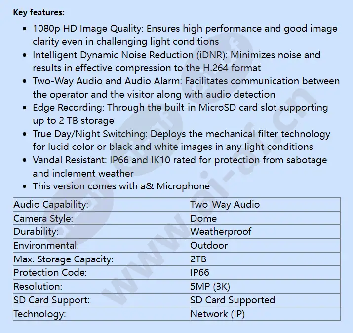 Bosch NDN-50051-V3 5MP Outdoor Dome IP Security Camera Offering top quality HD and MP images for challenging security and surveillance requirements, the Bosch NDN-50051-V3 Flexidome IP Outdoor 5000 1080p HD Vandal Resistant Dome Camera is truly a robust device. Equipped to deliver quality performance in low light conditions, it performs exceptionally well any time of the day or night. The intelligent Dynamic Noise Reduction (iDNR) feature effectively reduces noise and delivers compressed recordings in H.264 format, minimizing bandwidth and storage consumption by up to 30% compared to other H.264 cameras. With a 3 to 10 mm varifocal lens, it can capture even moving objects to precision. With tamper and motion detection features, the camera can detect movement and signal an alarm if there