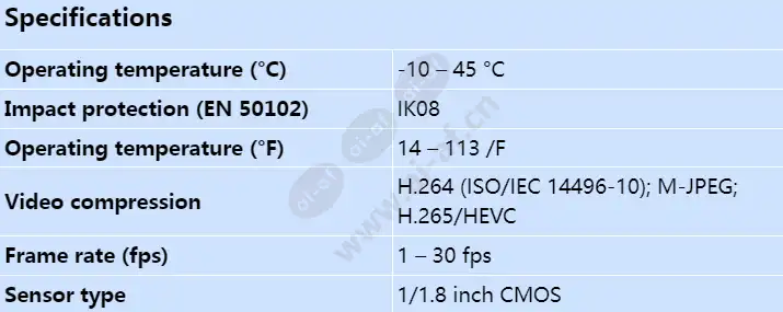 360° panoramic overview in 6MP resolution without blind spots High Dynamic Range to see every detail in both bright and dark areas of the scene Edge or client-side dewarping for easy integration and flexible viewing and recording Built-in Intelligent Video Analytics and Audio AI to trigger relevant alerts and quickly retrieve data Compact design for unobtrusive indoor use with quick and easy installation and set-up Frame rate (fps) 1 – 30 fps Impact protection (EN 50102) IK08 Operating temperature (°C) -10 – 45 °C Operating temperature (°F) 14 – 113 /F Sensor type 1/1.8 inch CMOS Video compression H.264 (ISO/IEC 14496-10); M-JPEG; H.265/HEVC
