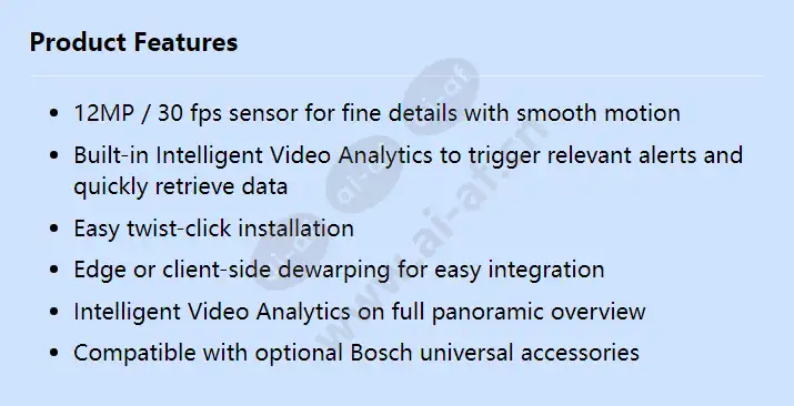 12MP / 30 fps sensor for fine details with smooth motion Built-in Intelligent Video Analytics to trigger relevant alerts and quickly retrieve data Easy twist-click installation Edge or client-side dewarping for easy integration Intelligent Video Analytics on full panoramic overview Compatible with optional Bosch universal accessories Impact protection (EN 50102) IK10 IP rating IP66 Minimum illumination in color (lx) 0.55 lx Minimum illumination in monochrome (lx) 0.18 lx Operating temperature (°C) -30 – 45 °C Sensor type 1/2.3 inch CMOS Video compression H.264 (ISO/IEC 14496-10); M-JPEG