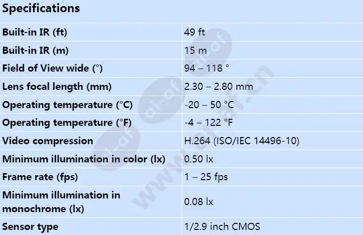 1080p and 5MP resolutions with fully configurable H.265 multi-streaming Built-in Essential Video Analytics to trigger relevant alerts and quickly retrieve data High Dynamic Range (120 dB) for challenging bright and dark scenes Built-in IR illuminator with 15 m (49 ft) viewing distance Built-in IR (ft) 49 ft Built-in IR (m) 15 m Field of View wide (°) 94 – 118 ° Frame rate (fps) 1 – 25 fps Lens focal length (mm) 2.30 – 2.80 mm Minimum illumination in color (lx) 0.50 lx Minimum illumination in monochrome (lx) 0.08 lx Operating temperature (°C) -20 – 50 °C Operating temperature (°F) -4 – 122 °F Sensor type 1/2.9 inch CMOS Video compression H.264 (ISO/IEC 14496-10)