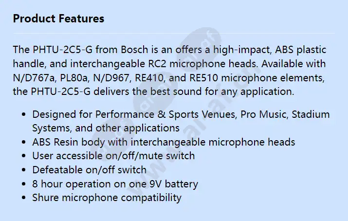 The PHTU-2C5-G from Bosch is an offers a high-impact, ABS plastic handle, and interchangeable RC2 microphone heads. Available with N/D767a, PL80a, N/D967, RE410, and RE510 microphone elements, the PHTU-2C5-G delivers the best sound for any application. Designed for Performance & Sports Venues, Pro Music, Stadium Systems, and other applications ABS Resin body with interchangeable microphone heads User accessible on/off/mute switch Defeatable on/off switch 8 hour operation on one 9V battery Shure microphone compatibility