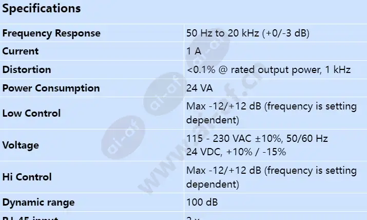 24 VDC, +10% / -15% Power consumption 24 VA Current 1 A Power consumption (maximum) 1 A Frequency response 50 Hz to 20 kHz (+0/-3 dB) Distortion <0.1% @ rated output power, 1 kHz Low Control Max -12/+12 dB (frequency is setting dependent) Hi Control Max -12/+12 dB (frequency is setting dependent) RJ-45 input 2 x Call station input For PLE-2CS(MM)