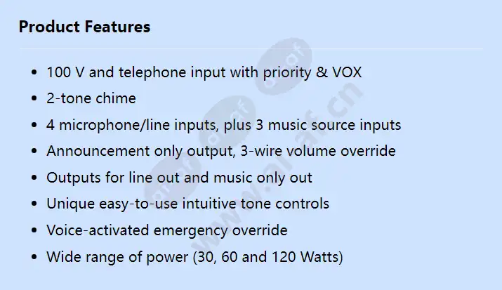 100 V and telephone input with priority & VOX 2-tone chime 4 microphone/line inputs, plus 3 music source inputs Announcement only output, 3-wire volume override Outputs for line out and music only out Unique easy-to-use intuitive tone controls Voice-activated emergency override Wide range of power (30, 60 and 120 Watts) Dimensions (H x W x D) (mm) 100 x 430 x 270 mm Maximum output power (W) 120 W Operating temperature (°C) -10 – 45 °C Weight (kg) 10.50 kg