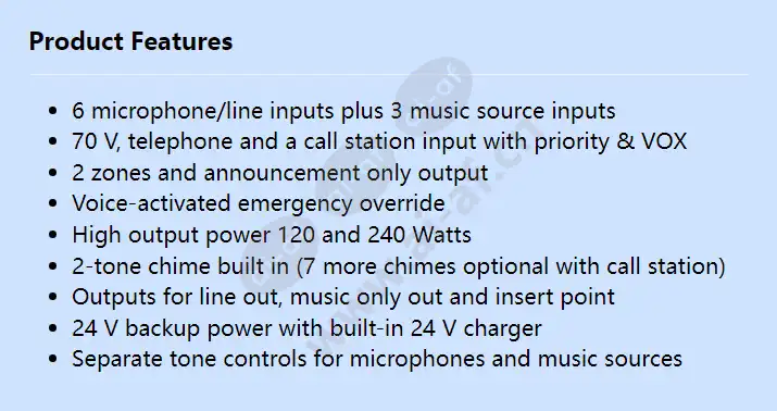 6 microphone/line inputs plus 3 music source inputs 70 V, telephone and a call station input with priority & VOX 2 zones and announcement only output Voice-activated emergency override High output power 120 and 240 Watts 2-tone chime built in (7 more chimes optional with call station) Outputs for line out, music only out and insert point 24 V backup power with built-in 24 V charger Separate tone controls for microphones and music sources Dimensions (H x W x D) (mm) 100 x 430 x 270 mm Maximum output power (W) 120 W Operating temperature (°C) -10 – 45 °C Weight (kg) 10.50 kg