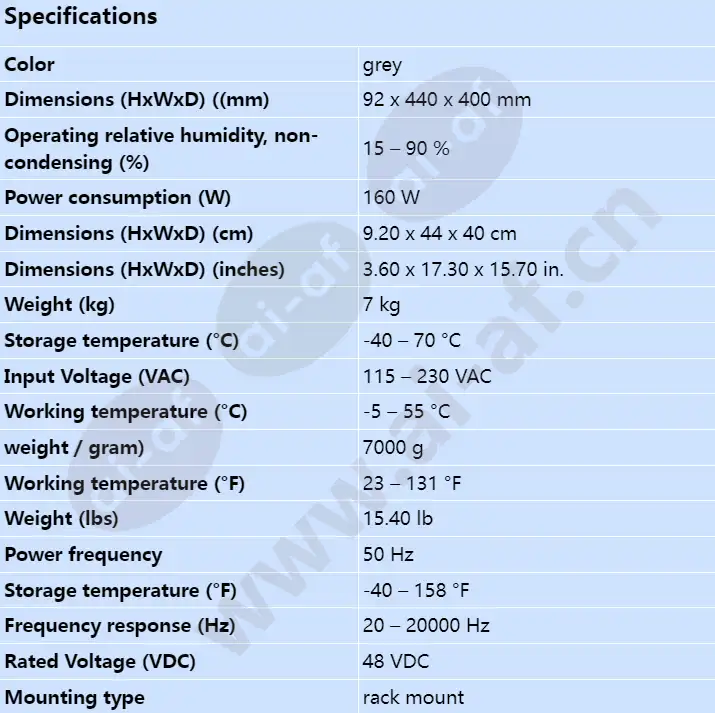 Public broadcasting and emergency voice alarm system control host Simultaneous control and transmission of 28 audio channels Ethernet interface for configuration, control, diagnosis and recording Digital storage function for saving pre-recorded information EN 54-16 and ISO 7240-16 system certification Power consumption (W) 160 W Storage temperature (°C) -40 – 70 °C Storage temperature (°F) -40 – 158 °F installation type rack mount Dimensions (HxWxD) (cm) 9.20 x 44 x 40 cm Dimensions (HxWxD) (inches) 3.60 x 17.30 x 15.70 in. Dimensions (HxWxD) ((mm) 92 x 440 x 400 mm Working temperature (°C) -5 – 55 °C Working temperature (°F) 23 – 131 °F Operating relative humidity, non-condensing (%) 15 – 90 % Power frequency 50 Hz Input Voltage (VAC) 115 – 230 VAC weight / gram) 7000 g Weight (kg) 7 kg