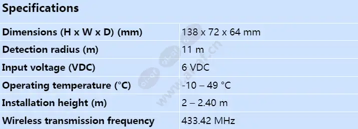 11 m x 11 m (35 ft x 35 ft) coverage Pet Immunity up to 45 kg (100 lb) Includes battery life extension feature Draft and insect immunity Supervised for low-battery, cover-tamper, and removal from mounting surface tamper conditions Operational up to 5 years using 4 user replaceable AA Alkaline Batteries Detection radius (m) 11 m Dimensions (H x W x D) (mm) 138 x 72 x 64 mm Input voltage (VDC) 6 VDC Installation height (m) 2 – 2.40 m Operating temperature (°C) -10 – 49 °C Wireless transmission frequency 433.42 MHz