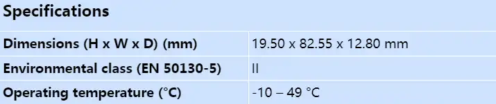 Internal magnetic reed switch contact Supervised for low-battery, cover-tamper, and removal from mounting surface tamper conditions Operational up to 5 years using a single, user replaceable Lithium AAA battery Dimensions (H x W x D) (mm) 19.50 x 82.55 x 12.80 mm Environmental class (EN 50130-5) II Operating temperature (°C) -10 – 49 °C