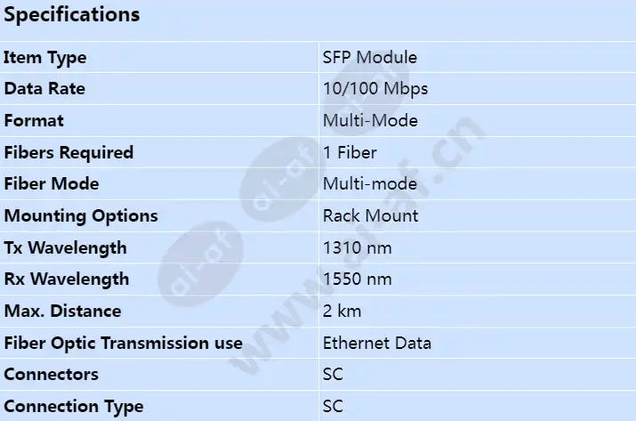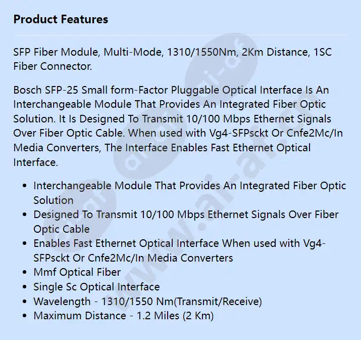 SFP Fiber Module, Multi-Mode, 1310/1550Nm, 2Km Distance, 1SC Fiber Connector. Bosch SFP-25 Small form-Factor Pluggable Optical Interface Is An Interchangeable Module That Provides An Integrated Fiber Optic Solution. It Is Designed To Transmit 10/100 Mbps Ethernet Signals Over Fiber Optic Cable. When used with Vg4-SFPsckt Or Cnfe2Mc/In Media Converters, The Interface Enables Fast Ethernet Optical Interface. Interchangeable Module That Provides An Integrated Fiber Optic Solution Designed To Transmit 10/100 Mbps Ethernet Signals Over Fiber Optic Cable Enables Fast Ethernet Optical Interface When used with Vg4-SFPsckt Or Cnfe2Mc/In Media Converters Mmf Optical Fiber Single Sc Optical Interface Wavelength - 1310/1550 Nm(Transmit/Receive) Maximum Distance - 1.2 Miles (2 Km) Item Type SFP Module