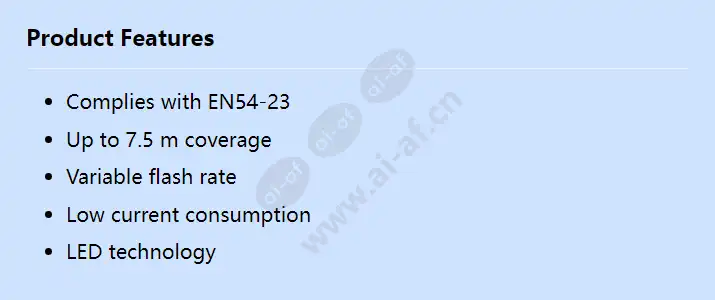 Complies with EN54-23 Up to 7.5 m coverage Variable flash rate Low current consumption LED technology IP rating IP33 installation type Ceiling Mount Working temperature (°C) -25 – 70 °C weight / gram) 100 g Color White