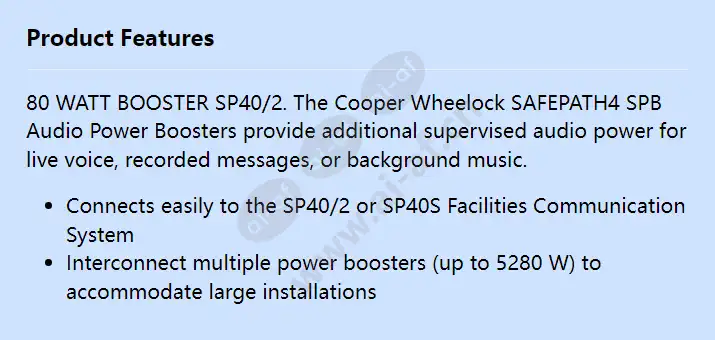 80 WATT BOOSTER SP40/2. The Cooper Wheelock SAFEPATH4 SPB Audio Power Boosters provide additional supervised audio power for live voice, recorded messages, or background music. Connects easily to the SP40/2 or SP40S Facilities Communication System Interconnect multiple power boosters (up to 5280 W) to accommodate large installations Home Control Wi-Fi Alarm I/O 2/2