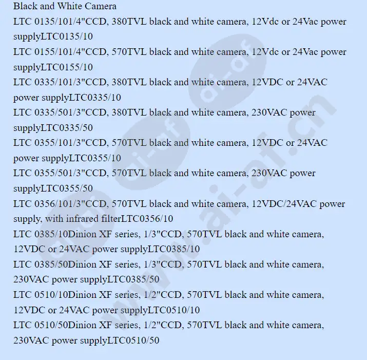 Bosch VCM0443/10C 1/3"CCD, 480TVL color video camera, 12VDC or 24VAC power supply, only for China VCM0443/10C color camera LTC 0235/10 1/4"CCD, 330TVL color camera, 12Vdc or 24Vac power supply LTC0235/10 LTC 0255/10 1/4"CCD, 480TVL color camera, 12Vdc or 24Vac power supply LTC0255/10 LTC 0435/10 1/3"CCD, 330TVL color camera, 12Vdc or 24Vac power supply LTC0435/10 LTC 0435/50 1/3"CCD, 330TVL color camera, 230Vac power supply LTC0435/50 LTC 0440/10C 1/3"CCD, 480TVL color video camera, 12VDC or 24VAC power supply, only for China LTC0440/10C LTC 0440/50C 1/3"CCD, 480TVL color camera, 230VAC power supply, only for China LTC0440/50C VCM0441/10C 1/3"CCD, 480TVL color video camera, 12VDC or 24VAC power supply, only for China VCM0441/10C VCM0441/50C 1/3"CCD, 480TVL color camera, 230VAC power