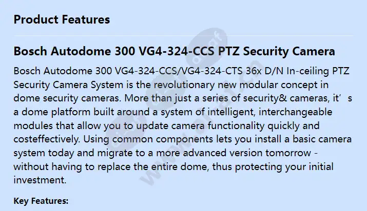 Bosch Autodome 300 VG4-324-CCS PTZ Security Camera Bosch Autodome 300 VG4-324-CCS/VG4-324-CTS 36x D/N In-ceiling PTZ Security Camera System is the revolutionary new modular concept in dome security cameras. More than just a series of security& cameras, it’s a dome platform built around a system of intelligent, interchangeable modules that allow you to update camera functionality quickly and costeffectively. Using common components lets you install a basic camera system today and migrate to a more advanced version tomorrow - without having to replace the entire dome, thus protecting your initial investment. Key Features: High-speed PTZ dome Fully interchangeable CPUs, cameras, housings, communications, and mounts 540TVL 36x day/night night camera with 128x wide dynamic range Optional