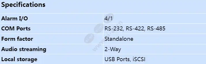 Dual-channel encoder with Dual Streaming High-quality MPEG-4 from QCIF to 4CIF USB and iSCSI recording Ultra-compact size Multicast and Internet streaming Alarm inputs and relay output 3 Year Warranty Form Factor Standalone Local Storage USB Ports, iSCSI Audio Streaming 2-Way COM Ports RS-232, RS-422, RS-485 Alarm I/O 4/1