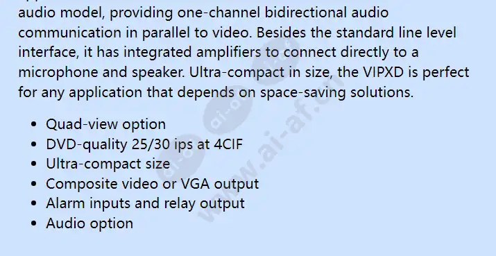 The VIPXD displays DVD-like quality MPEG-4 and MPEG-2 encoded video at up to 25/30 images per second from PAL or NTSC sources over IP networks. Establish the video connections automatically with the encoder, decoder, or Bosch’s comprehensive video management system. Set up the VIPXD to display video in single-view or quad-view mode. It is capable of decoding up to four MPEG-4 video streams at the same time. Control the viewing mode remotely via a management system like VIDOS. Alternatively, the VIPXD can drive a VGA display directly, thus is ideally suited for applications like flatscreen monitor walls. The VIPXD is available as an audio model, providing one-channel bidirectional audio communication in parallel to video. Besides the standard line level interface, it has integrated