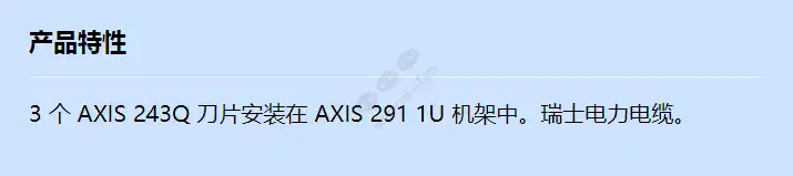 3 个 AXIS 243Q 刀片安装在 AXIS 291 1U 机架中。瑞士电力电缆。