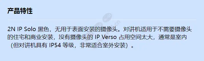2N IP Solo 黑色,无用于表面安装的摄像头。对讲机适用于不需要摄像头的住宅和商业安装,没有摄像头的 IP Verso 占用空间太大,通常是室内(但对讲机具有 IP54 等级,非常适合室外安装)。