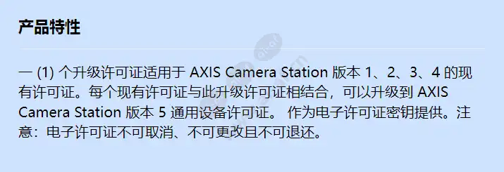 一 (1) 个升级许可证适用于 AXIS Camera Station 版本 1、2、3、4 的现有许可证。每个现有许可证与此升级许可证相结合,可以升级到 AXIS Camera Station 版本 5 通用设备许可证。 作为电子许可证密钥提供。注意:电子许可证不可取消、不可更改且不可退还。