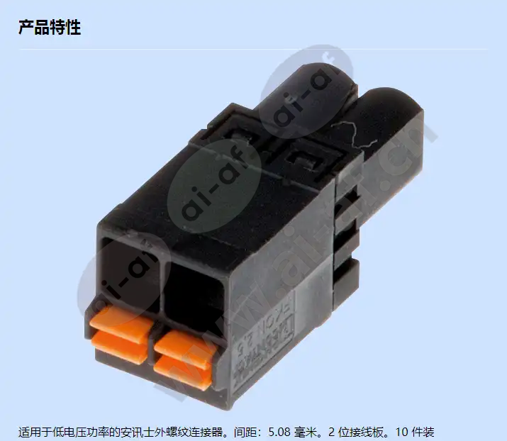 适用于低电压功率的安讯士外螺纹连接器。间距:5.08 毫米。2 位接线板。10 件装 兼容产品 固定摄像机 AXIS Q1700-LE AXIS Q1765-LE AXIS Q1765-LE PT Mount AXIS Q1775 AXIS Q1785-LE AXIS Q1786-LE AXIS Q1798-LE 热成像网络摄像机 AXIS Q1931-E AXIS Q1931-E PT Mount AXIS Q1932-E AXIS Q1932-E PT Mount AXIS Q1941-E AXIS Q1941-E PT Mount AXIS Q1942-E AXIS Q1942-E PT Mount AXIS Q2901-E AXIS Q2901-E PT Mount 电缆和连接器 AXIS Multicable C I/O音频电源 防护罩 AXIS T93F10室外外壳