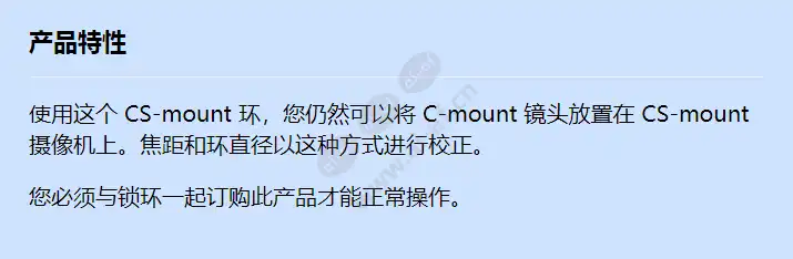 使用这个 CS-mount 环,您仍然可以将 C-mount 镜头放置在 CS-mount 摄像机上。焦距和环直径以这种方式进行校正。 您必须与锁环一起订购此产品才能正常操作。