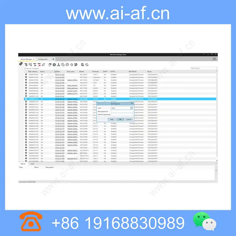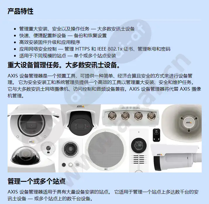 管理重大安装、安全以及操作任务 — 大多数安讯士设备 快速、便捷配置新设备 — 备份和恢复设置 高效安装固件升级和应用程序 应用网络安全控制 — 管理 HTTPS 和 IEEE 802.1x 证书、管理帐号和密码 适用于不同规模的站点 — 单个或多个站点安装 重大设备管理任务。大多数安讯士设备。 AXIS 设备管理器是一个预置工具,可提供一种简单、经济合算且安全的方式来进行设备管理。 它为安全安装工和系统管理员提供一个高效的工具以管理重大安装、安全和维护任务。 它与大多数安讯士网络摄像机、访问控制和音频设备兼容。AXIS 设备管理器将代替 AXIS 摄像机管理。 管理一个或多个站点 AXIS 设备管理器适用于具有大量设备安装的站点。 它适用于管理一个站点上多达数千台的安讯士设备 — 或多个站点上的数千台设备。 许多设备管理功能 AXIS 设备管理器提供广泛的功能来管理主要的安装、安全和维护设备管理任务。 观看介绍如何在 AXIS 设备管理器中管理每项任务的教学视频。 介绍如何在 AXIS 设备管理器中管理每项任务。 安装 分配IP地址 导出设备列表并保持跟进资产* 用户和密码管理* ACAP管理 基于LTS或Active *的固件 HTTPS证书管理* 管理IEEE 802.1x证书*¹ 设备标记 维护 设备状态 收集设备数据 配置设备并将配置复制到多台设备中 连接到多个服务器/系统 还原点 恢复出厂默认设置 替换设备 证书续签和管理* 网络安全强化* *指示网络安全功能 *¹ 目前不支持 Active Directory 证书服务;已针对在 Linux 上运行的 FreeRADIUS 进行验证 工作中的 AXIS 设备管理器 配置设备并将配置复制到多个设备 将标准参数(包括操作规则,流配置文件,设备时间和IP设置)配置到多个设备。 从已经设置的设备到多个设备的重复配置。