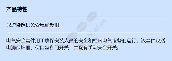 保护摄像机免受电涌影响 电气安全套件用于确保安装人员的安全和柜内电气设备的运行。该套件包括电涌保护器、保险丝和门开关,并配有手动安全开关。