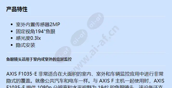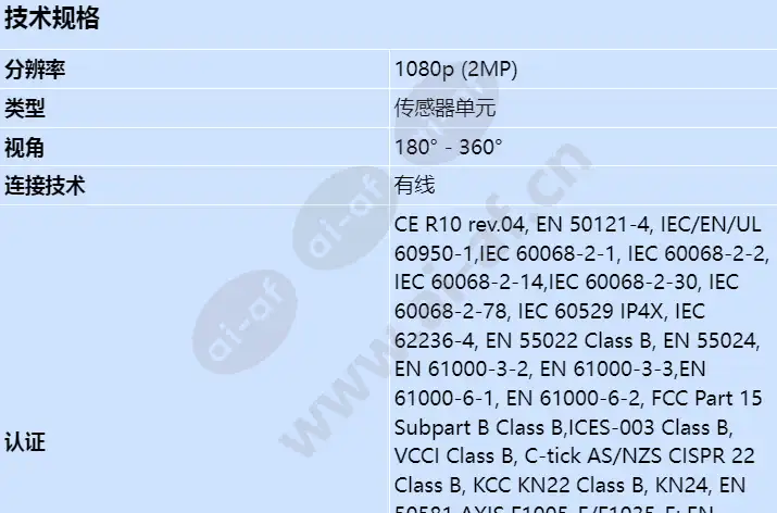 室外内置传感器2MP 固定视角194°鱼眼 感光度0.3lx 隐式安装 鱼眼镜头适用于室内或室外的宽屏监控 AXIS F1035-E 非常适合在大面积的室内、室外和车辆监控应用中进行非常隐式的覆盖。就像公共汽车和电车一样。与 AXIS F 主机一起使用时,AXIS F1035-E 提供 1080p 分辨率和水平视野为 194º 的鱼眼镜头。该设备还支持宽动态范围 (WDR) - Forensic Capture,非常适合具有非常亮和暗区域的场景。坚固的 AXIS F1035-E 可抵抗灰尘、雨、雪、振动和冲击后果。它配有一根 3 或 12 m (10/39 ft.) 的预组装电缆,用于连接到主机。包括可变角度安装支架。 主要特征: 灵活、坚固的设计,适用于室内、室外和移动设备 1080p分辨率鱼眼镜头 超宽194°水平视野 支持 WDR - Forensic Capture(使用 AXIS F41 / F44 主机) 分辨率 1080p (2MP) 视角 180° - 360° 宽度 30 毫米 深度 30 毫米 身高 62 毫米 重量 96克 工作温度 (T-T) -30 - 55 °C 连接技术 有线 Wi-Fi N 类型 传感器单元 产品颜色 黑色的 外壳材料 Aluminium 国际保护(IP)代码 IP66 认证 CE R10 rev.04, EN 50121-4, IEC/EN/UL 60950-1,IEC 60068-2-1, IEC 60068-2-2, IEC 60068-2-14,IEC 60068-2-30, IEC 60068-2-78, IEC 60529 IP4X, IEC 62236-4, EN 55022 Class B, EN 55024, EN 61000-3-2, EN 61000-3-3,EN 61000-6-1, EN