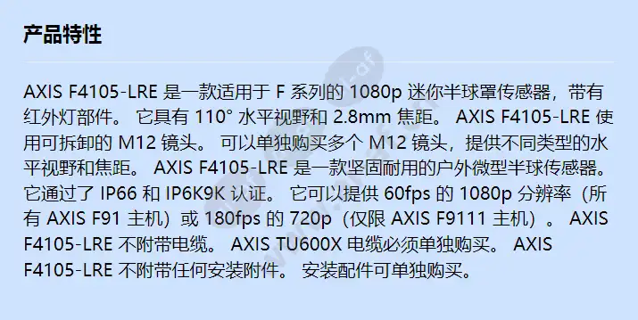 AXIS F4105-LRE 是一款适用于 F 系列的 1080p 迷你半球罩传感器,带有红外灯部件。 它具有 110° 水平视野和 2.8mm 焦距。 AXIS F4105-LRE 使用可拆卸的 M12 镜头。 可以单独购买多个 M12 镜头,提供不同类型的水平视野和焦距。 AXIS F4105-LRE 是一款坚固耐用的户外微型半球传感器。 它通过了 IP66 和 IP6K9K 认证。 它可以提供 60fps 的 1080p 分辨率(所有 AXIS F91 主机)或 180fps 的 720p(仅限 AXIS F9111 主机)。 AXIS F4105-LRE 不附带电缆。 AXIS TU600X 电缆必须单独购买。 AXIS F4105-LRE 不附带任何安装附件。 安装配件可单独购买。